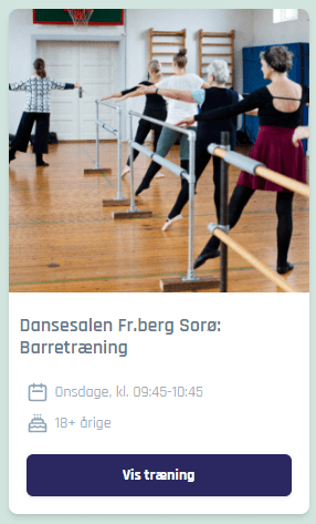 Når vi opretter jeres hold på prøvetime-platformen, får hvert hold en “landing page” med et unikt link (url). Dette link sættes ind på jeres egen hjemmeside – fx i holdbeskrivelsen – så er det oplagt for nye at tilmelde sig en gratis prøvetime med det samme. I kan også få en oversigt over alle jeres hold indlejret på jeres hjemmeside via en integration (se eksempel her eller billedet nedenfor).
